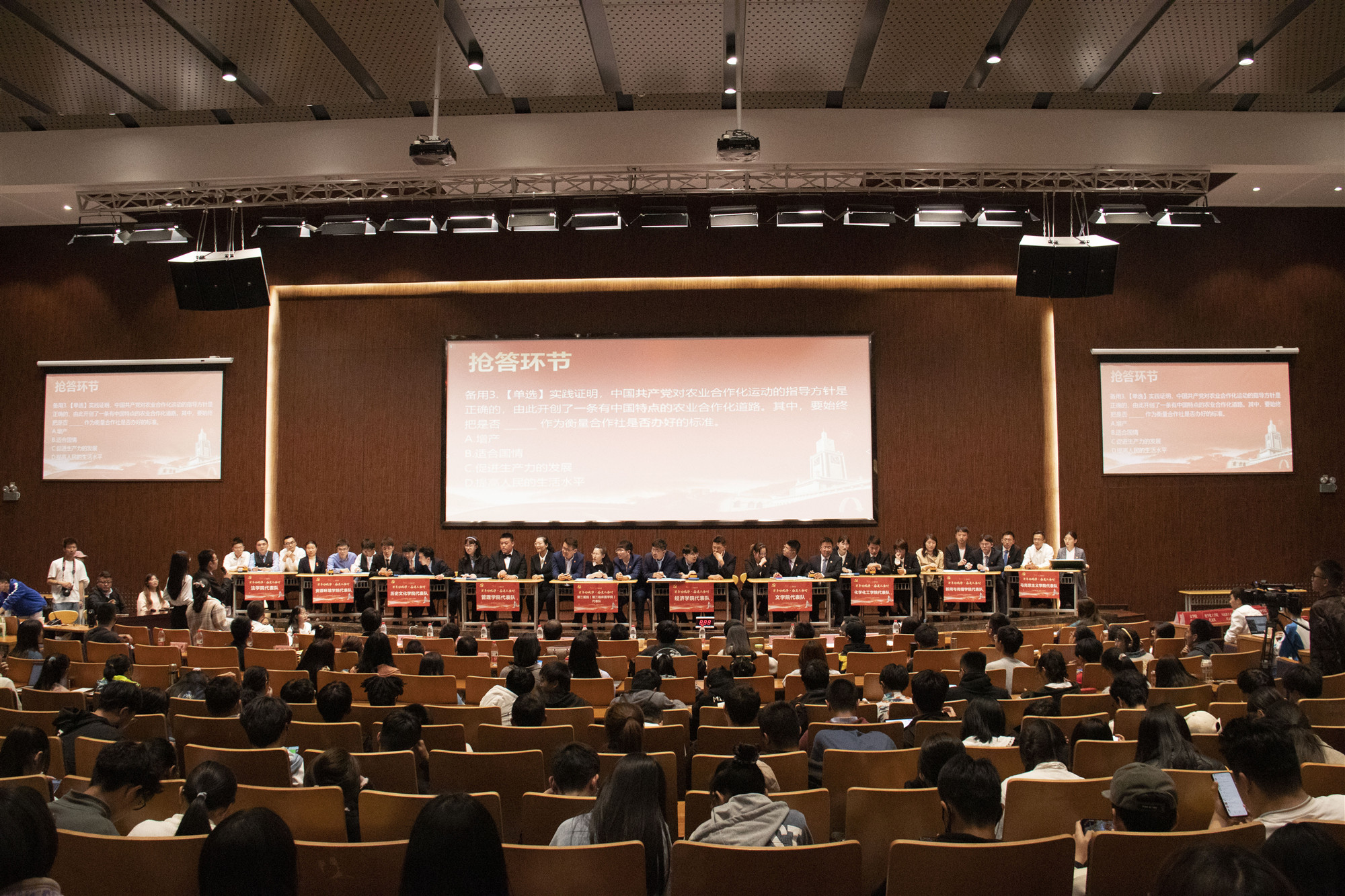 经过充足的准备,4月22日,正式迎来了第二阶段党史知识对抗赛,本次竞赛包括两两对抗、集体对抗、终极对抗三个环节。两两对抗环节中,10支队伍现场抽签分为5组,第二医院(第二临床医学院)代表队与经济学院代表队为第四组进行对抗。在此环节中,我院队员沉着冷静、慎重作答,取得满分的好成绩。集体对抗环节中,10支队伍进行抢答,抢答铃声此起彼伏,多一秒犯规,少一秒便错失机会,答题气氛愈加紧张激烈,但我院队员们依然不骄不躁、稳扎稳打。