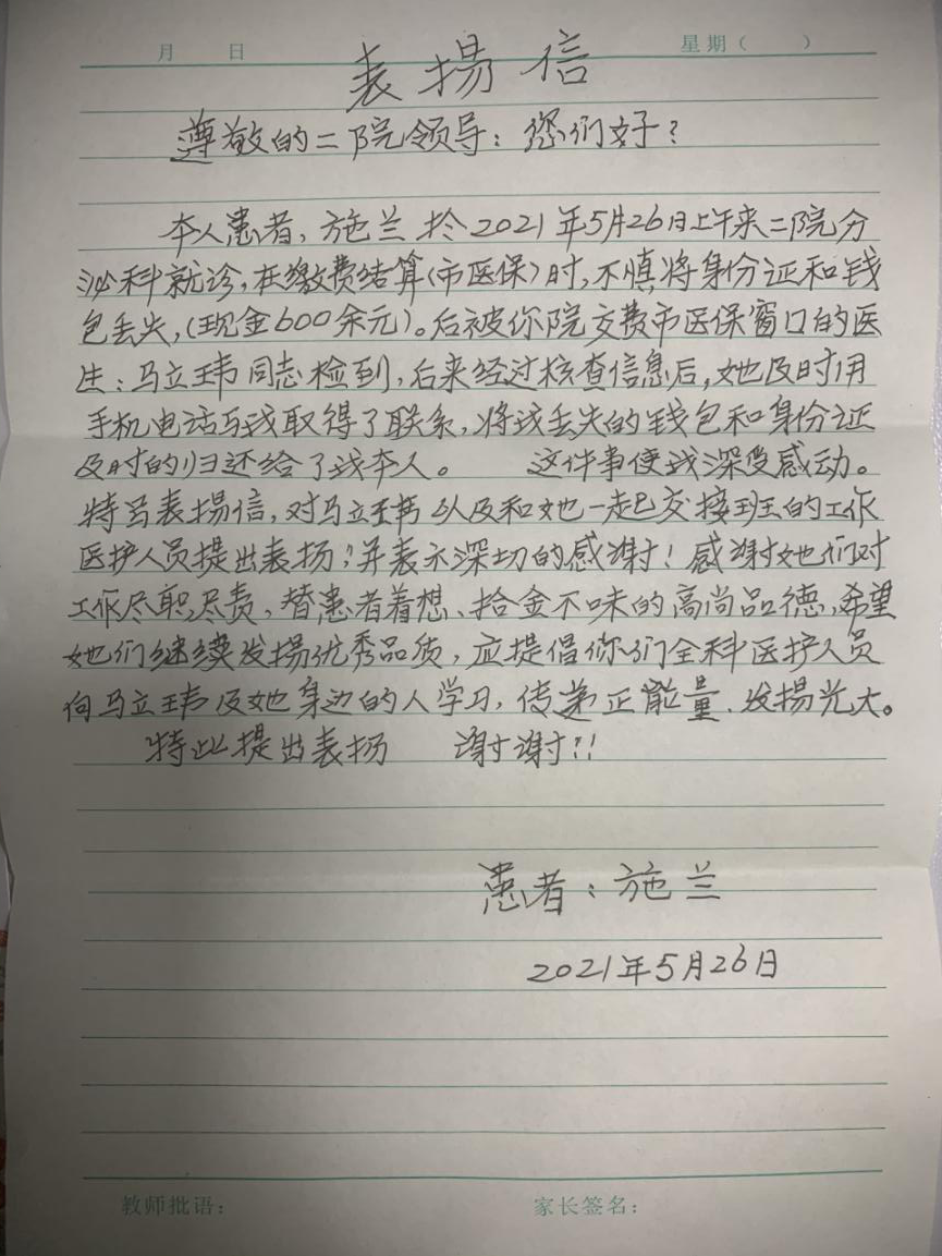 马立玮拾金不昧的高尚品德和为患者着想的医者仁心,充分体现了她过硬的道德品质和朴实的精神风貌。施女士还写了表扬信,并且希望所有人都可以向马立玮学习,将想患者之所想,急患者之所急这种精神发扬光大!我们应该为这样的正能量点个赞!
