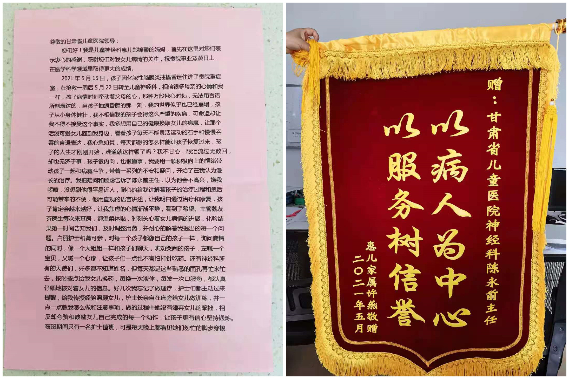 6月1日晨,在小儿神经科病区发生了感人的一幕,患儿心心(化名)的妈妈将一副写有“以病人为中心,以服务树信誉”的锦旗递到了科主任陈永前手中,又将一份情真意切的感谢信递交给护士长王亚莉,她激动地表达了对小儿神经科全体医护人员的感激之情。