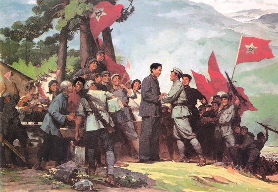 1928年4月,朱德、陈毅率领南昌起义保留下来的部队在江西宁冈同毛泽东率领的湘赣边界秋收起义部队会师。图为油画《井冈山会师》