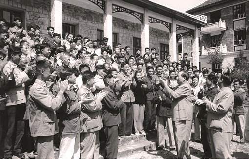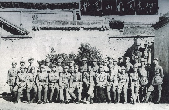 1927年10月,毛泽东率领湘赣边界秋收起义的部队到达江西宁冈古城。毛泽东在这里主持召开前委扩大会议,总结起义经验教训,讨论在井冈山建立革命根据地问题。图为毛泽东和参加湘赣边界秋收起义的部分人员于1937年在延安合影