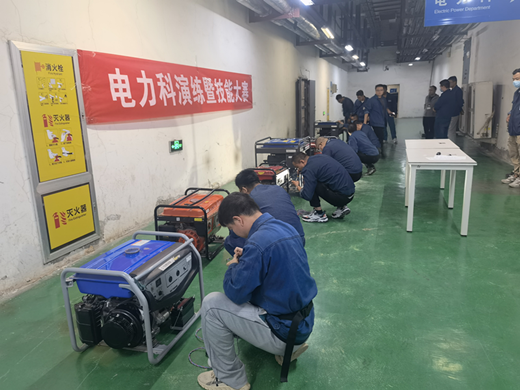 发电机演练通过小型汽油发电机的实操比武和模拟在突发停电情况下启动大型柴油发电机保障应急供电两个科目,演练由每个职工轮流现场操作。