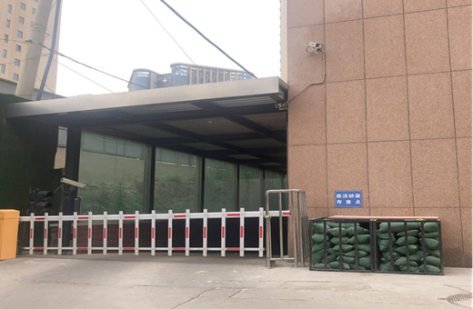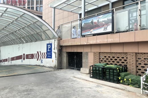 医院各车库入口摆放防汛沙袋