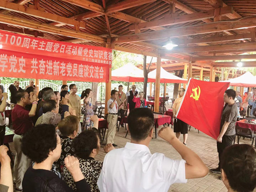 随后,老党员向新党员赠送《中国共产党章程》并共同学习了部分章节。大家在鲜红的党旗前重温入党誓词,在齐唱《没有共产党就没有新中国》的激扬旋律中结束交流。