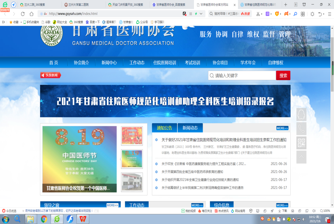1. 使用电脑打开搜索:甘肃省医师协会官网,或输入网址http://www.gsysxh.com/,点击网站顶端“2021 甘肃省住院医师规范化培训及助理全科医生培训报名入口”。