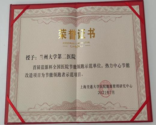兰大二院荣获“蓝源杯医院节能领跑示范单位”荣誉称号 热力中心节能改造项目荣获“节能领跑者示范项目”