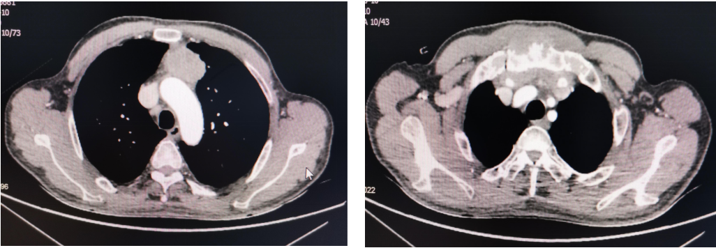 患者,男性61岁,于入院前半年出现前胸壁疼痛不适,活动时加重,当地医院行胸部正位片未见明显异常,积极止疼治疗,效果不佳,遂来我院就诊。胸外科主任医师蒋鹏查体发现胸骨柄凸起,压痛(+),遂行胸部CT+三维成像检查,结果提示:纵隔肿物、胸骨柄骨质破坏、双侧胸锁关受侵。头颅MRI、全身骨显像、腹部CT未见肿瘤转移。