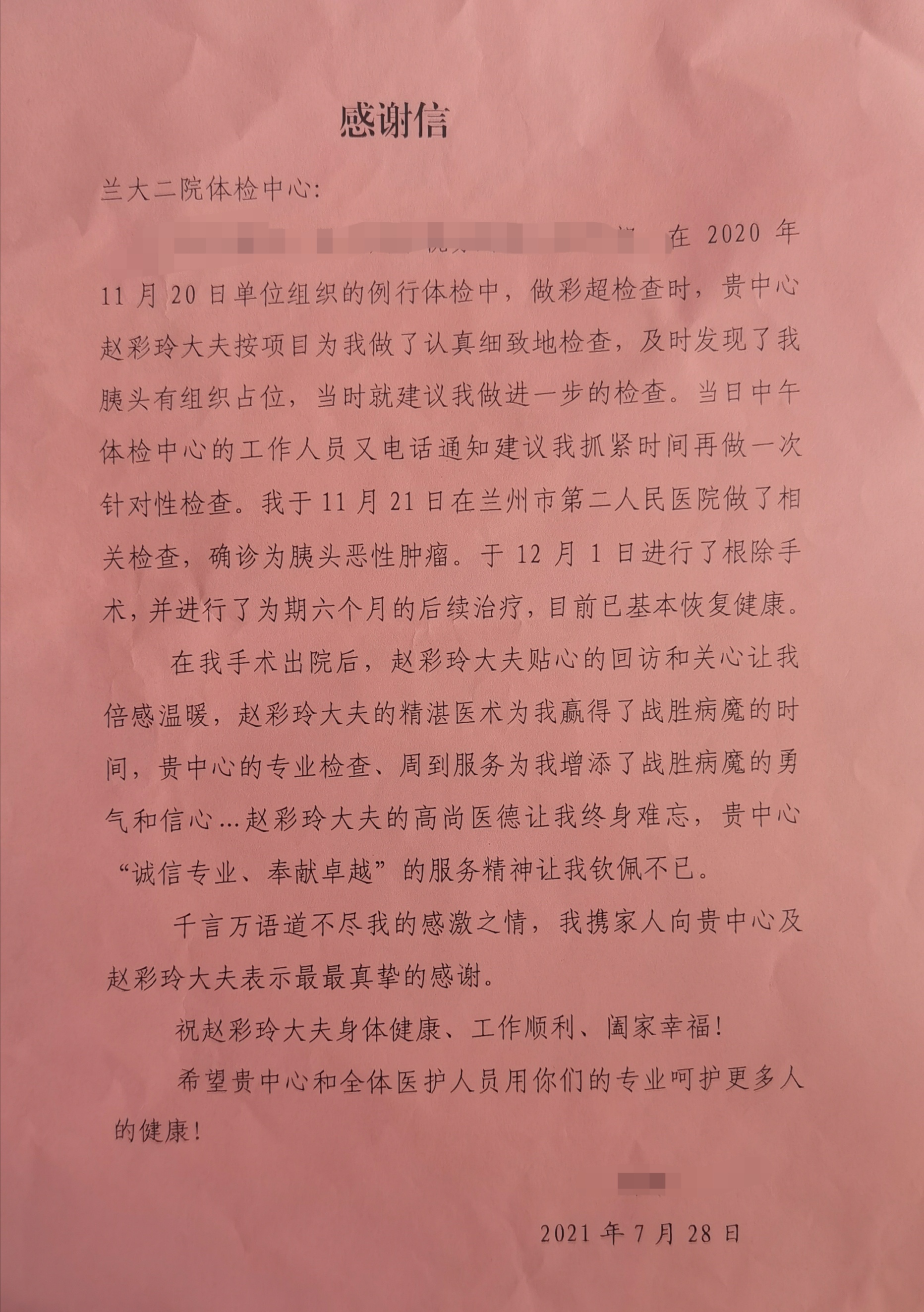 专业的检查、及时的发现、贴心的回访,让韩先生及其家人万分感激,在身体康复之后特意来我院健康管理中心表达自己衷心的感谢。对于收到感谢信,赵彩玲大夫表示,感谢信是对自己及中心所有工作人员的赞许,更是鼓励与信任,也是对每一位医护人员一点一滴付出的认可和肯定,同时也是一种鞭策,今后她将会继续努力,为更多的受检者提供更好的服务。