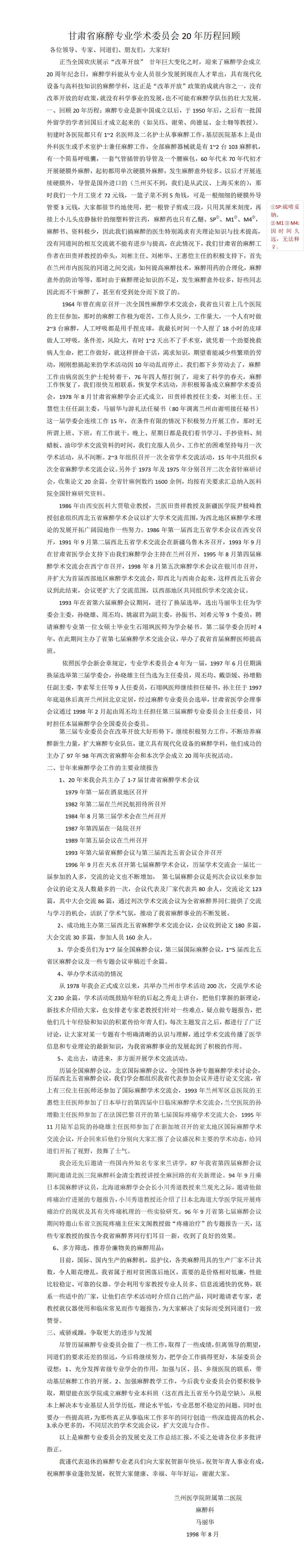 马丽华教授“甘肃省麻醉专业学术委员会20年历程回顾”原文