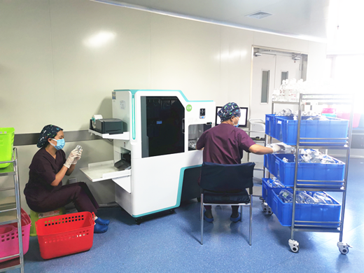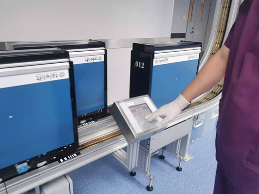 静脉中心还配备2台“自动分拣机”(静脉用药智能分拣系统),自动将成品液体按科室分拣,全流程双人复核,全过程具可追溯性,提高了成品输液的分拣效率和准确率,使药品及时用于患者。