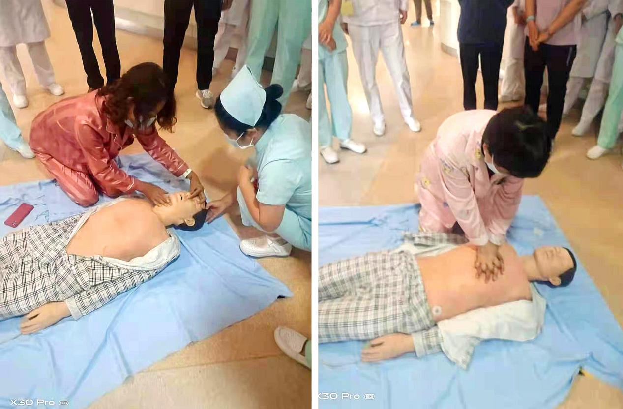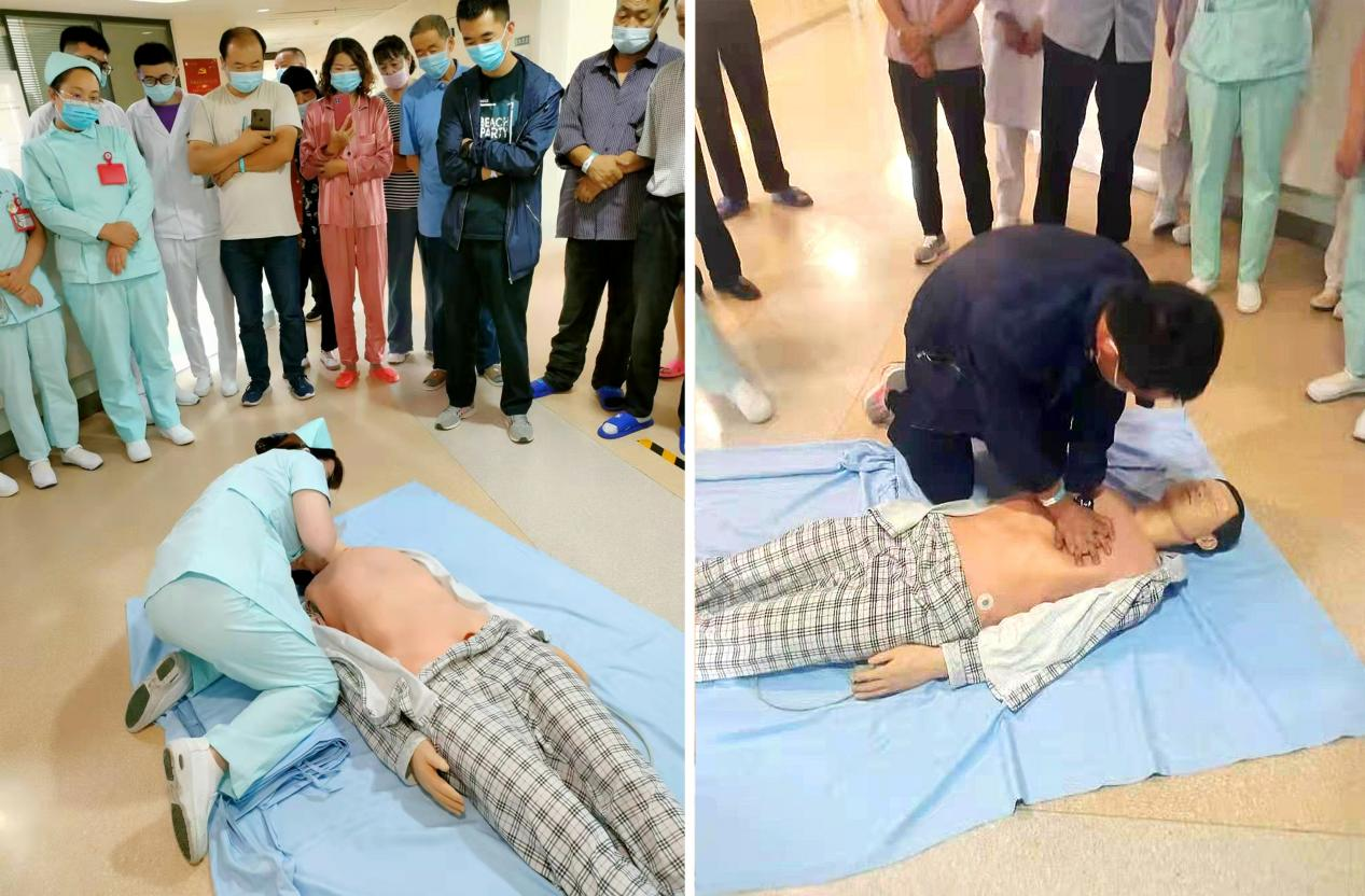 演练以病房为单位,医护人员用通俗易懂的语言为患者及家属详细讲解了当突发心脏骤停时如何在“4-6分钟”的黄金救援期运用心肺复苏术挽救生命,通过评估现场环境、判断患者意识、检查呼吸、进行胸外心脏按压、打开气道、实施人工呼吸等步骤来进行急救,并利用实物人体模型进行了细致、规范的现场演示。