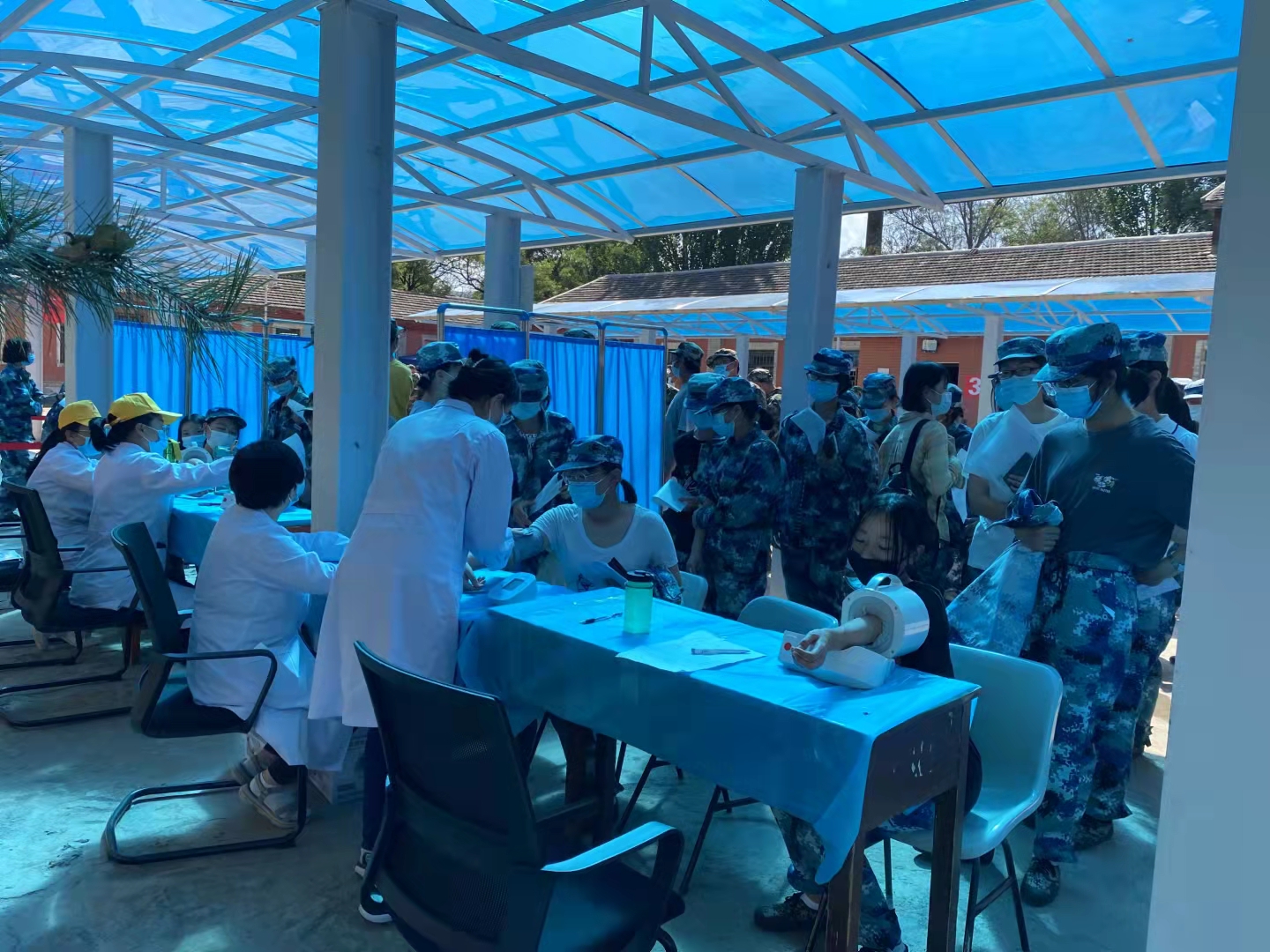 体检现场,大家以饱满的工作热情和熟练的业务技能全身心投入工作,对入学新生开展抽血化验、测视力、查听力、辨嗅觉,测量血压、心率,心肺听诊、胸部X光片、腹部触诊等系统体检。此外,校医院还参与新生军训医疗保障工作。