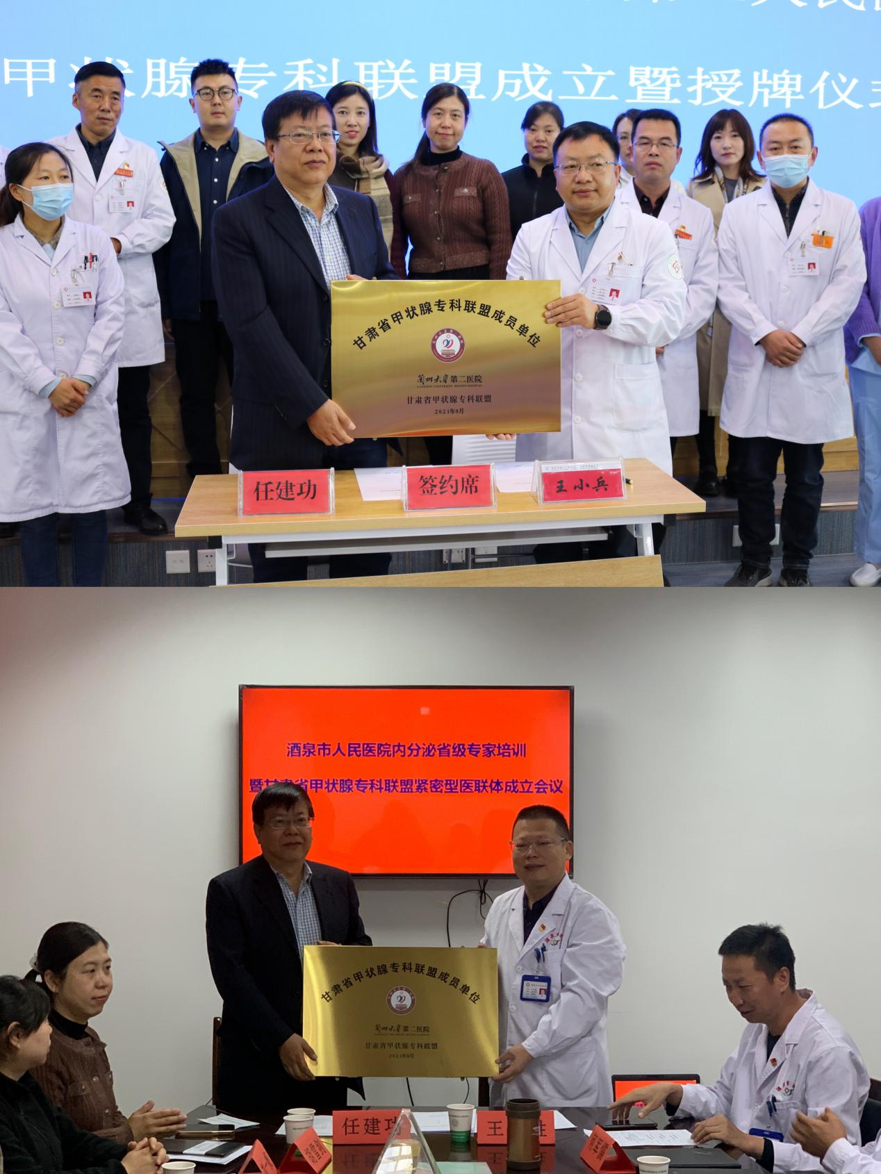 10月12日—13日,立博欧赔指数第二医院内分泌代谢科主任任建功带领内分泌代谢科、发展规划处相关工作人员赴酒泉市第一人民医院、第二人民医院开展甘肃省甲状腺专科紧密型医联体建设工作,并签订甘肃省甲状腺专科联盟紧密型医联体合作协议并颁发授牌。目前,立博欧赔指数第二医院内分泌代谢科已对7家成员单位全部完成全年甘肃省甲状腺专科联盟紧密型医联体签约及授牌工作。