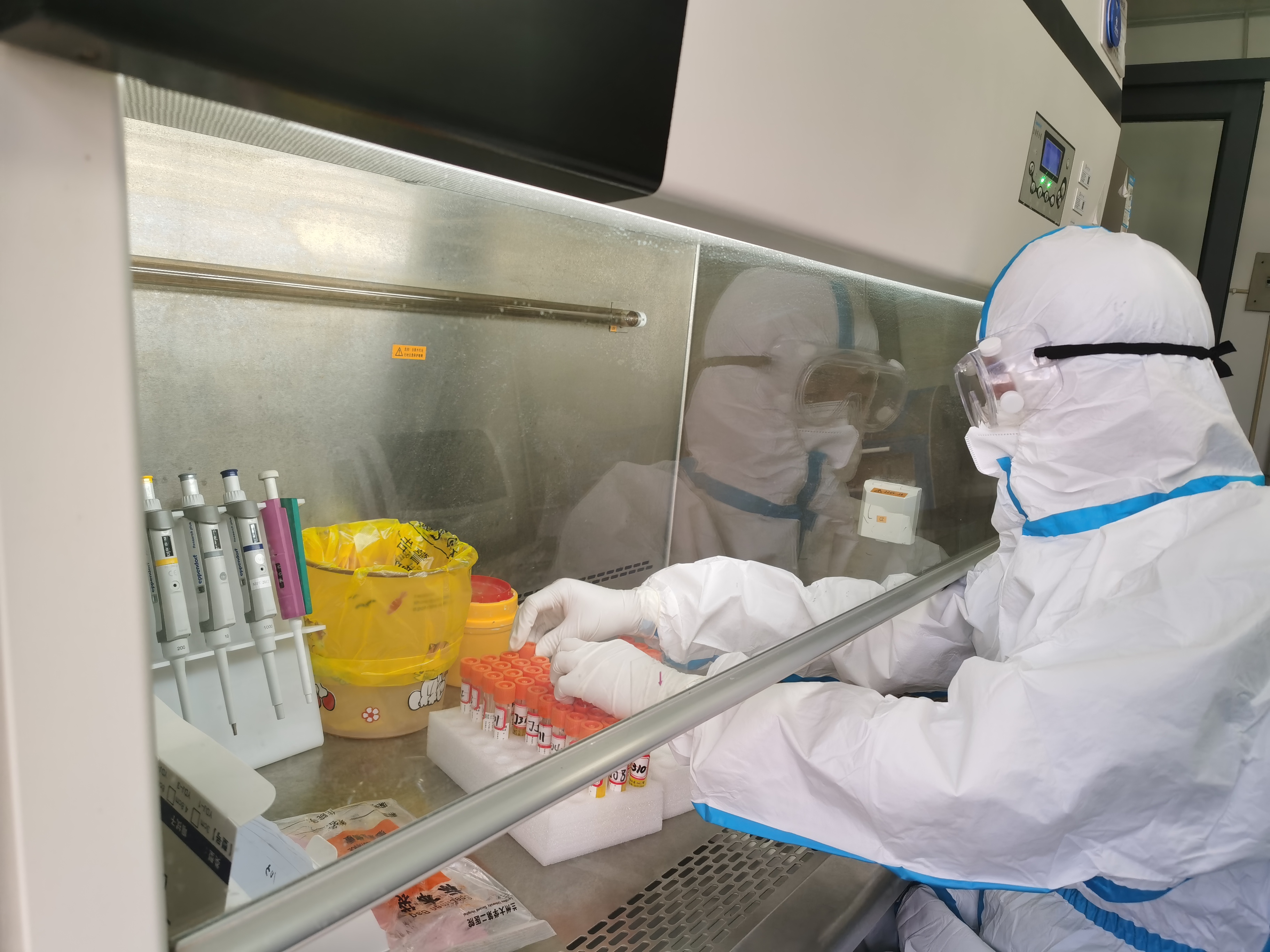 面对疫情防控的严峻形势及核酸检测日增长量的突然暴涨,检验医学中心深知责任重大,检测结果的快速准确,是核酸检测工作者必须面对与完成的艰巨任务。检验医学中心抽调科室具有PCR上岗证的检验人员积极开展检测工作,一天分3个班次,一个班有3人上班,平均每天工作20小时,最高达22小时,检测量高达965管。(1管可检测10人份标本)