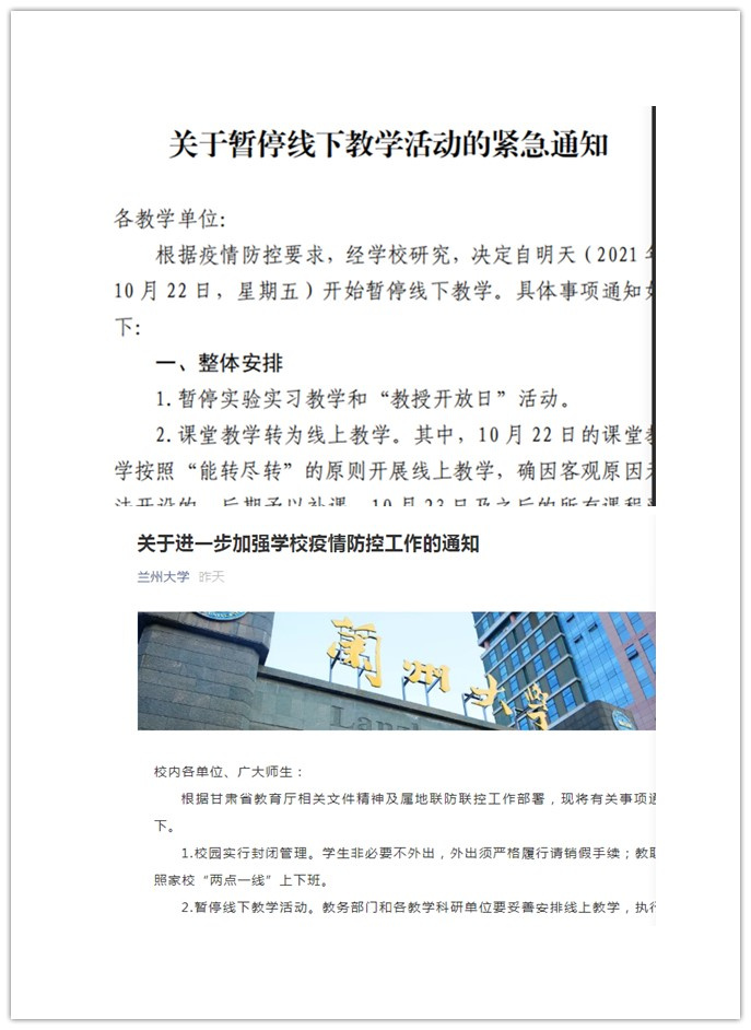 面对兰州市疫情防控新形势,第二临床医学院积极响应学校和医院相关要求,积极做好线上教学工作的统筹、组织、协调、保障和监督以及学生管理工作。同时部分管理人员积极参与到医院预检分诊、社区和街道核酸采集等疫情防控工作中。学生也积极响应,组成抗疫先锋队奔赴一线。