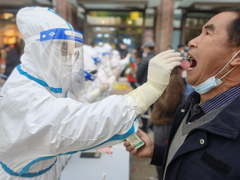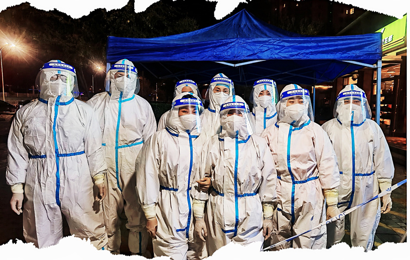 我被护理姐妹们的“巾帼不让须眉”感动了。21日临近中午,当我们还在为全面接种“第三针疫苗”做准备的时,突然接到紧急参加核酸样本采集队支援兰州各采集点的任务,我和科里的四位姐妹来不及换衣服,电话里通知各自的老公照顾好家里和孩子就出发了。当天我们被分配到鸿运润园北门检测点,看着已经排成长龙的人群,我们换好防护服随即投入到“战斗”中去。我们这一组共计10人,其中8女2男,他们是顾冰、杨楠、刘霞、邹晓文、施妍、续珍晶、曾裕斐、赵龙和张文瑞。然而在连续十多个小时的高强度工作中,我根本没有看到姐妹们平时的那份柔弱。