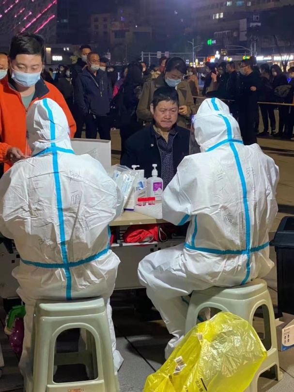 命令就是使命,一刻不敢耽误。当我们到达指定的核酸标本采集点时早已等待采集标本的群众热烈欢呼,我们心头一顫,这将是多么艰巨的任务呀!我立即穿好防护服,投入到紧张而有序的工作中。