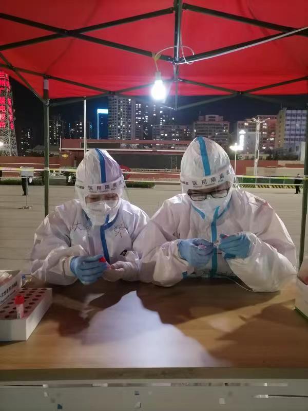 第一轮支援皋兰路街道的核酸采样任务中,青年队员们发扬连续作战,不怕苦不怕累的精神,为了让群众尽快完成核酸检测,队员们全力以赴优质高效的采样,连续作战10多个小时,采样工作结束时已经是凌晨2点了。深夜的兰州静悄悄,每组工作人员均完成了一千多份核酸样本的采集工作,望着自己的“战斗成果”,隔着面屏,大家长舒一口气。
