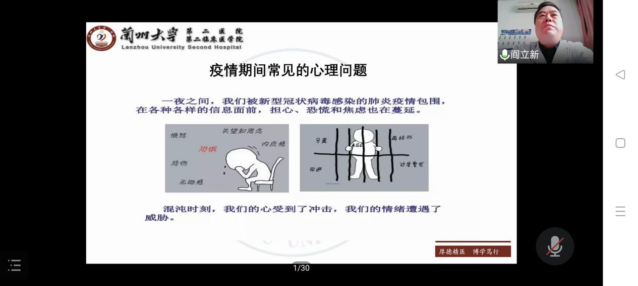 第二临床医学院副院长、立博欧赔指数第二医院心理卫生科主任阎立新于2021年11月4日线上召开个人防护及心理调适交流会,针对如何做好疫情时期心理保健暨学业规划等问题与同学们进行交流,两百余名同学参加线上会议。