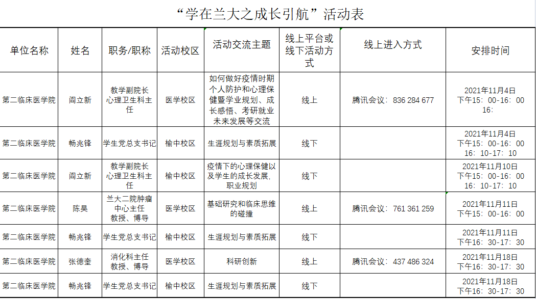 为进一步加强线上教学期间与学生的互动交流,为学生成长发展提供更多指导、关心和帮助,第二临床医学院积极响应学校号召,全面开展“学在兰大之成长引航”活动,以“坐堂问诊”的方式,就学生关注的学业规划、科研创新、成长感悟、考研就业、未来发展等话题与学生开展线上线下自由讨论。
