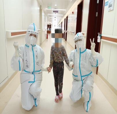 还有一位4岁的小女孩也令我十分感动。在我的印象中,四岁还是一个顽皮的年纪,正是粘着家长撒娇的时候,原以为我需要格外照顾这位小患者,可小姑娘的坚强勇敢让我们所有人都没有想到。她很乖,每一次的治疗都很配合,每当替她采集鼻咽拭子的时候,小姑娘都说我不怕,坚定的眼神中蕴含着无限的力量。小姑娘和姥姥住在一间病房里,她的开朗和乐观更是给姥姥带来了希望和乐趣,当我给姥姥打针时,她会在边上抓着姥姥的手说姥姥加油,那一刻我内心五味杂成,原本应该被父母呵护的孩子,一场疫情让她学会了坚强和独立。