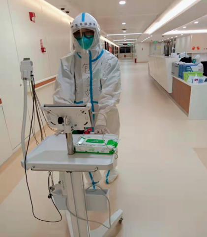 经过严格培训,来到了重离子医院。第一次穿戴好装备进入病区的那一刻,心跳呼吸加快,防护面屏被雾气覆盖,视线受到阻挡,戴着防护口罩连呼吸都是困难的,那一刻,真想冲出病区,卸掉武装,痛快的呼吸两口新鲜空气。可是职责告诉我,不能退缩!我重新调整了自己的心态,努力克服了各种不适,投入到患者的救治工作中。