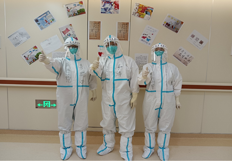 新二科病区患儿较多,天真活泼的他们画抗疫画为我们加油,在楼道相互追逐嬉闹,相互之间都成了好朋友。穿着防护服的我们,听着他们天真烂漫的笑声,幸福又恍惚,这欢声笑语是我们多么期待的美好啊!想象他们在阳光下、在广场上、在游乐园,不用戴口罩,也没有偶尔的咳嗽声,该是多么的美好啊!这就是我们的使命,是全社会各条抗疫战线上所有同胞们为之奋斗的目标!