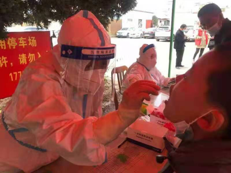 10月21日早晨,护士长紧急通知,医院需外派人员采集核酸,大家都积极踊跃请战,但是当时病区患者满员,最终,是由刚下夜班的李晓娜、王晖、石明钰三名护士临危受命。她们没来的及吃午饭,就匆匆赶往张苏滩水磨石厂采集点。