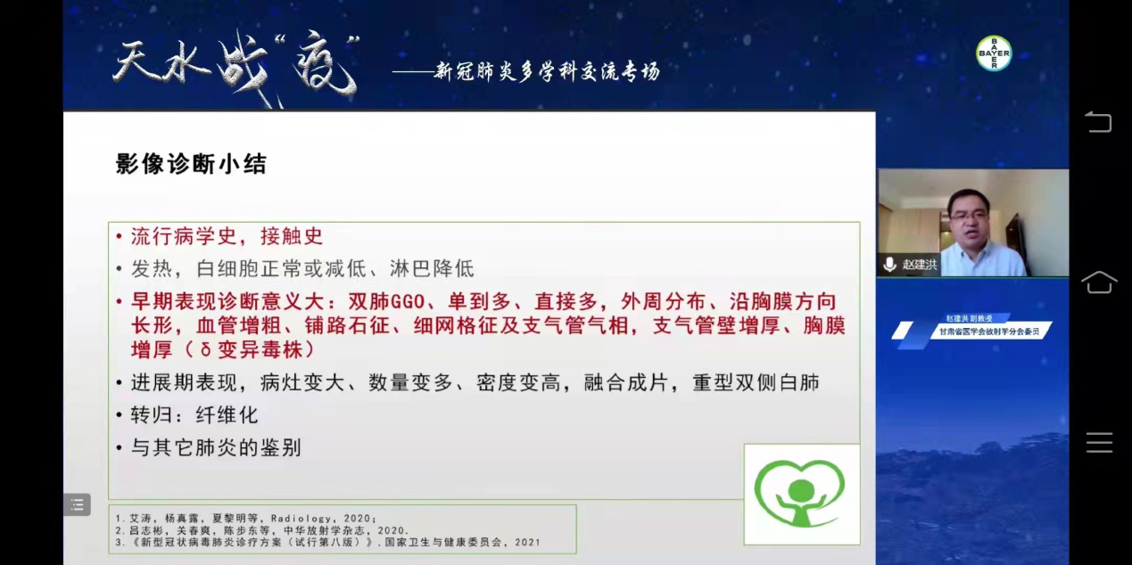 才下战场、又上课堂。为了应对后续的疫情风险,他在接受上级任务安排后,决心运用自己的专业知识,培养一支“带不走的队伍”。此后,他积极整理资料、归纳心得、精心准备课件,并在11月12日线上召开的“天水战`疫'——新冠肺炎多学科交流专场”交流会上,进行了不同专业的联合培训授课。交流会直播当天,千名医疗工作者参加培训,赵建洪详细讲解了新冠肺炎的影像表现以及本次疫情呈现出来的新特点,交流群里讨论激烈,大家收益颇多。
