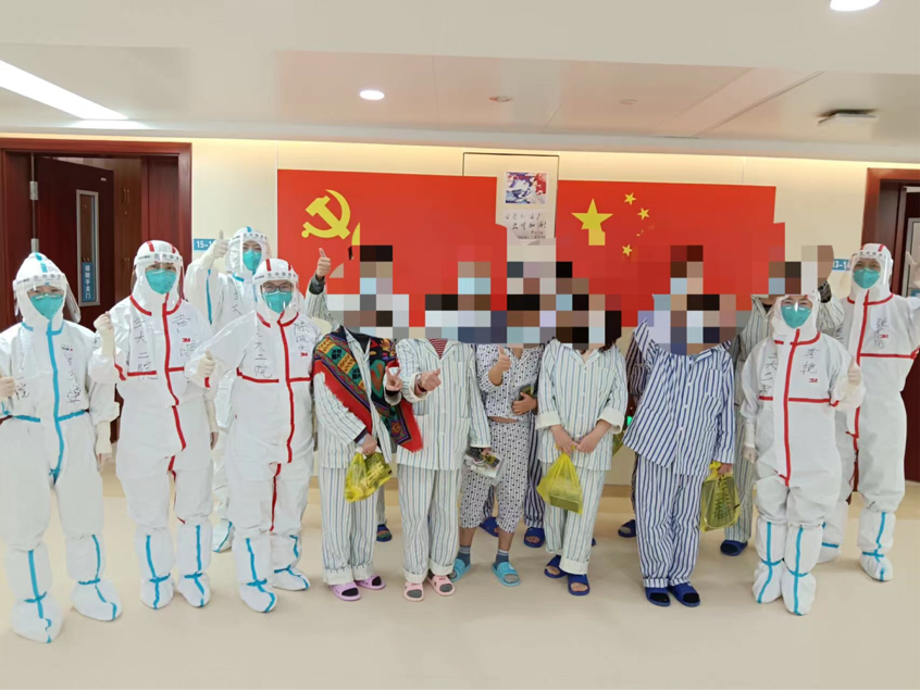 4天前的那个下午班,我们病区总共有13个患者出院,还记得送患者走出病区完成最后消杀的那一刻,所有的人都很高兴,我们一起合了影。印象最深刻的是有一位少先队员还向我们医护人员敬了少先队队礼,看着少年那稚嫩却又充满朝气蓬勃的面容,看着那高高举起的右臂,那一刻我的眼睛湿润了,我的内心是火热的,这一刻我感觉自己所有的付出都是值得的,从未有过的一种自豪感一点点蔓延开来。走出病区大门,大家隔着玻璃依然在挥手告别,那一刻我为自己是这个集体中的一员而感到无比自豪。