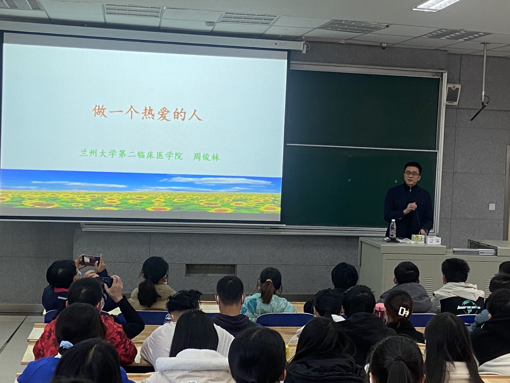 周俊林分享的题目是“做一个热爱的人”。他以海子的一首诗带大家走进了讲座,从爱人、爱生活到爱事业,从自己的学习经历讲到工作经历,深入简出,风趣幽默,循循诱导。周老师鼓励同学们树立正确爱的概念,即:爱人、爱事业、爱单位、爱祖国,因为有爱,事业能够进步;因为有爱,生活更加幸福。他强调年轻人要有家国情怀,青年是整个社会力量中最积极、最有生气的力量,是时代的中坚和脊梁,作为青年学生一定首先要爱国、爱人民,爱父母,同时要培养自己业余爱好并坚持下去,以爱为原动力,为理想坚持奋斗。