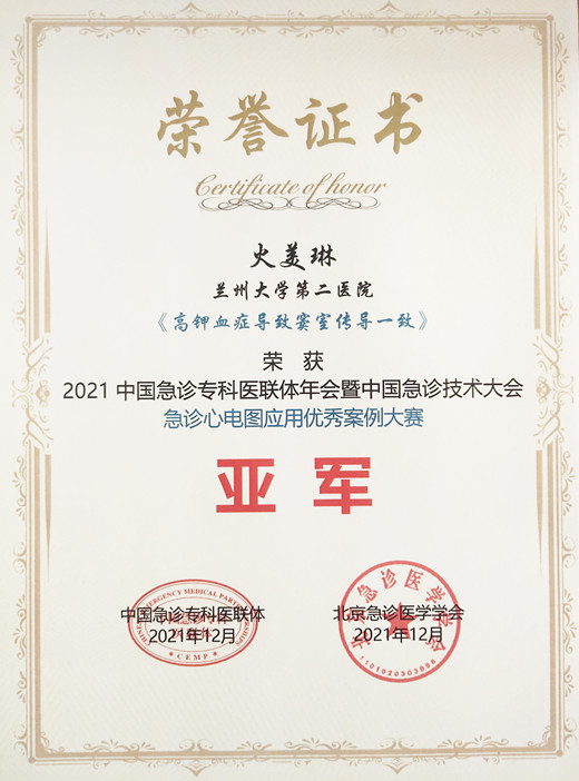 我院急诊团队在急救中心主任李培武的带领下积极主动投稿,最终李佩容医师的病例作品《无法站立的厨师》荣获“急诊抗感染精英赛”版块优秀奖,火美琳医师的病例作品《高钾血症致窦室传导一例》荣获急诊心电图应用优秀案例”版块亚军。