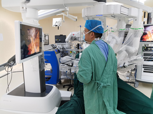该患者由于脾功能亢进,其红细胞及血小板均低于正常值,难以耐受传统开腹手术的巨大创伤。同时,严重的肝硬化门脉高压会导致术中出血风险,因而对手术操作的精细及精准度要求极高。机器人辅助操作能够最大限度地避免术中损伤和出血,起到创伤小、恢复快的效果。