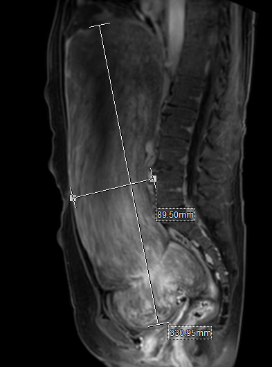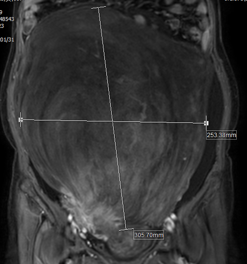 患者,女性,57岁,以“发现腹部包块增大半年”收住医院妇科,入院后查体显示腹部膨隆,如足月妊娠大小,腹部可触及一约35*25cm大小包块,质硬,活动性差,上界达剑突,下界至盆底,行MRI检查提示:盆腹腔巨大占位性病变,大小约144*258*347mm大小,多考虑间叶源性肿瘤性病变,肌源性肿瘤可能性大。