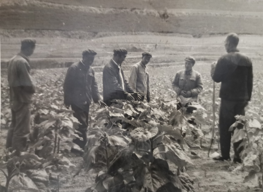 1972年,单得真(右二)在段渠村烟叶地里查看烟叶的长势情况