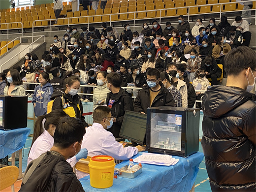 疫苗接种前,医护人员认真做好各项准备工作,提前演练接种流程、部署应急保障措施、合理规划疫苗接种场地,通过积极准备,全力保障疫苗接种工作的顺利开展。接种现场划分为测温预检区、登记区、审核区、接种区、留观区等。在登记处,医护人员仔细核对师生身份信息、询问、核查身体状况和疫苗接种情况、告知接种禁忌,核对无误后签署知情同意书。登记、审核完成后,接种师生分批进入接种区注射新冠疫苗,疫苗接种现场秩序井然。