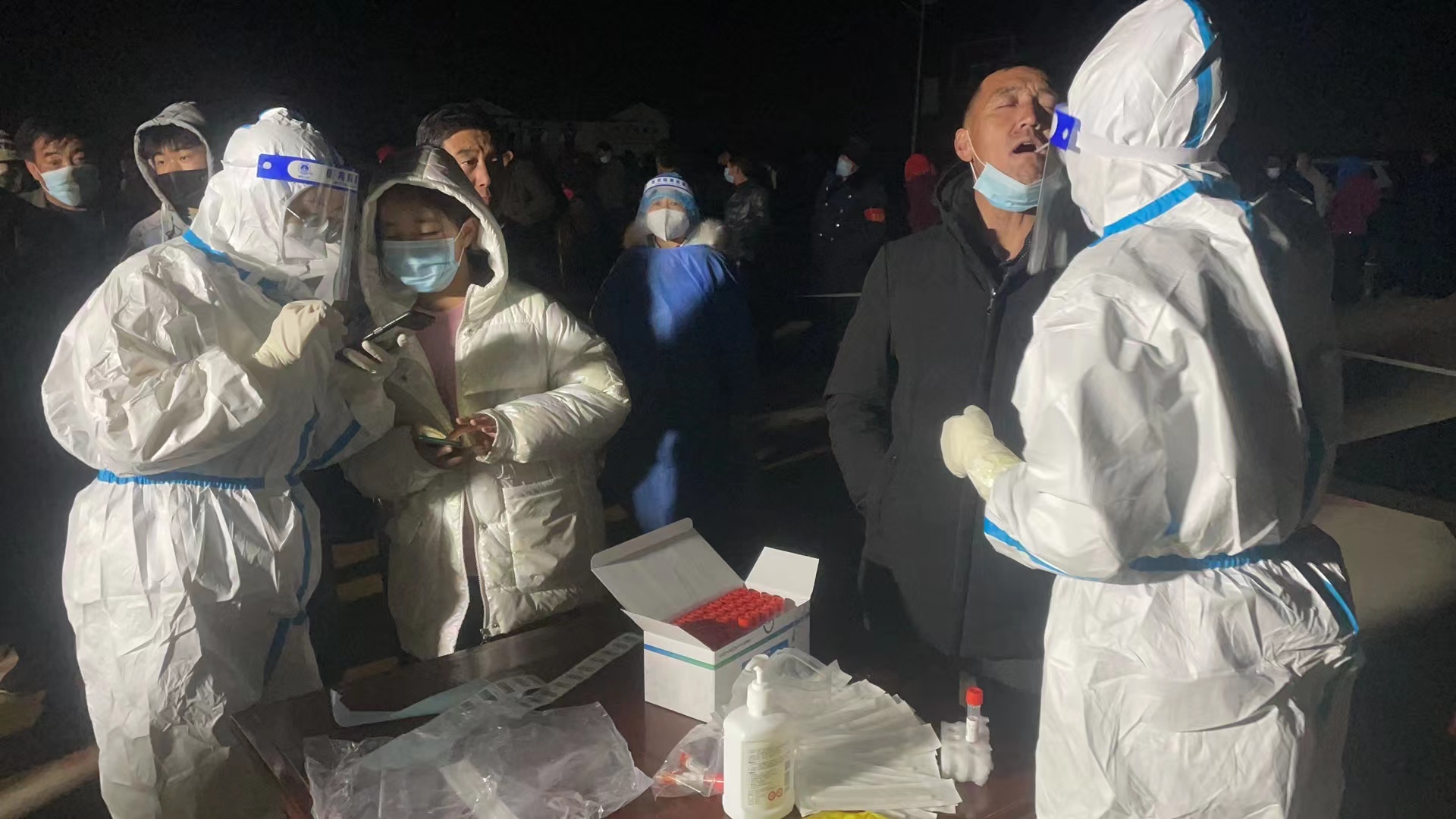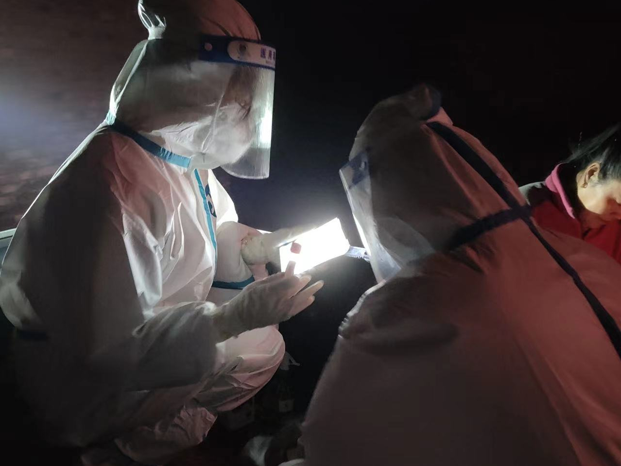 初春的三月,昼夜温差大,为了尽快完成全员核酸排查工作,大家不顾寒冷连夜工作到凌晨4点。截止3月9日凌晨,共采集核酸33851人次。