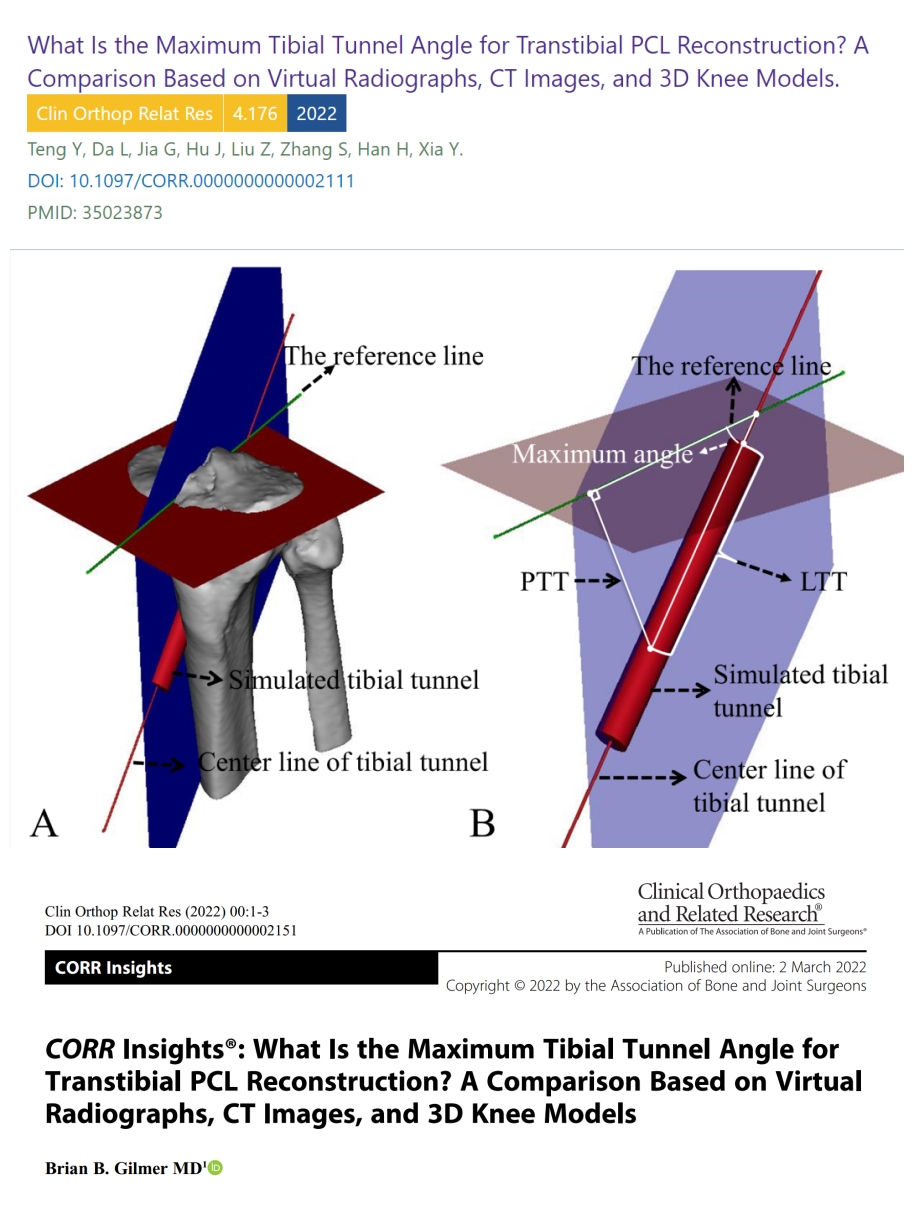 近日,兰大二院骨科夏亚一教授团队在国际一流骨科期刊《Clinical Orthopaedics and Related Research》(英文简称CORR)发表原创性研究成果:“What Is the Maximum Tibial Tunnel Angle for Transtibial PCL Reconstruction? A Comparison Based on Virtual Radiographs, CT Images, and 3D Knee Models”。该文通讯单位为兰大二院,骨科一病区滕元君医师为第一作者,夏亚一教授为通讯作者。据悉,CORR杂志是美国骨与关节外科医师协会(Association of Bone and Joint Surgeons)的官方刊物,中科院、JCR骨科1区杂志,最新影响因子4.18,为国际骨科Top期刊之一。