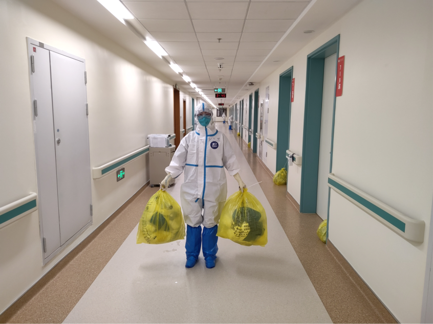 在日常工作中,医务组的老师们负责把控整个工作,提供患者信息,解决一切工作中遇到的问题。护理组每班次负责接收患者,做治疗、发放餐食、完成消杀工作,病区走廊、病房、患者卫生间、电梯间,大家不放过任何一个死角。每班还会及时总结当天班次出现的问题,分析原因,并及时加以改进。院感组的老师们会仔细检查我们进病房前的穿、戴,出病房时的脱、卸,一刻也不敢放松警惕,打包缓冲区垃圾、开展消杀工作等。