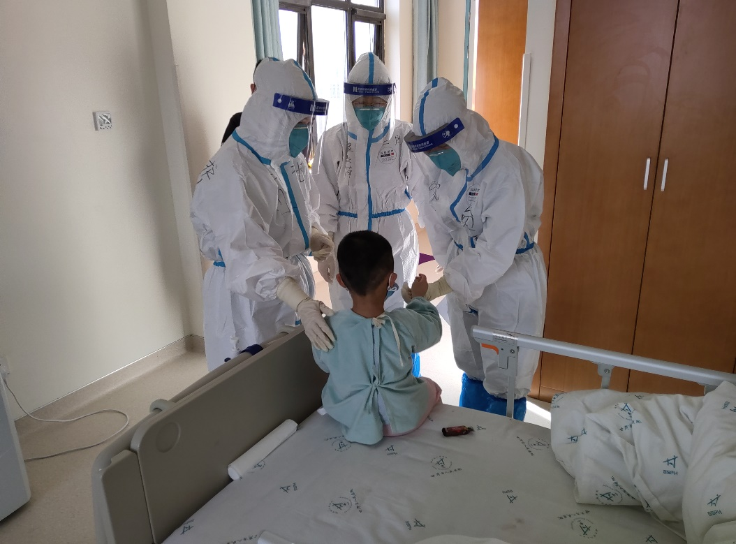 还记得一天早上,刘玉娟护士长“神秘”的拿着一个袋子走到我面前,“贠老师,这是出发前我从家里带来的一包糖,看着孩子们太可怜了,我想给他们每人几颗糖,让他们喜悦一些”。作为一位母亲,我很能理解刘护士长现在的心情,也希望孩子们能够树立战胜病毒的信心。于是在刘护士长的带领下,我们开始发放糖果,有个2岁的孩子,拿到糖果后激动地在病床上跳起来,他还不懂什么是病毒、不懂为什么身边出现了这么多身穿白衣的哥哥、姐姐,但他知道手里的糖很甜,收到礼物很开心。