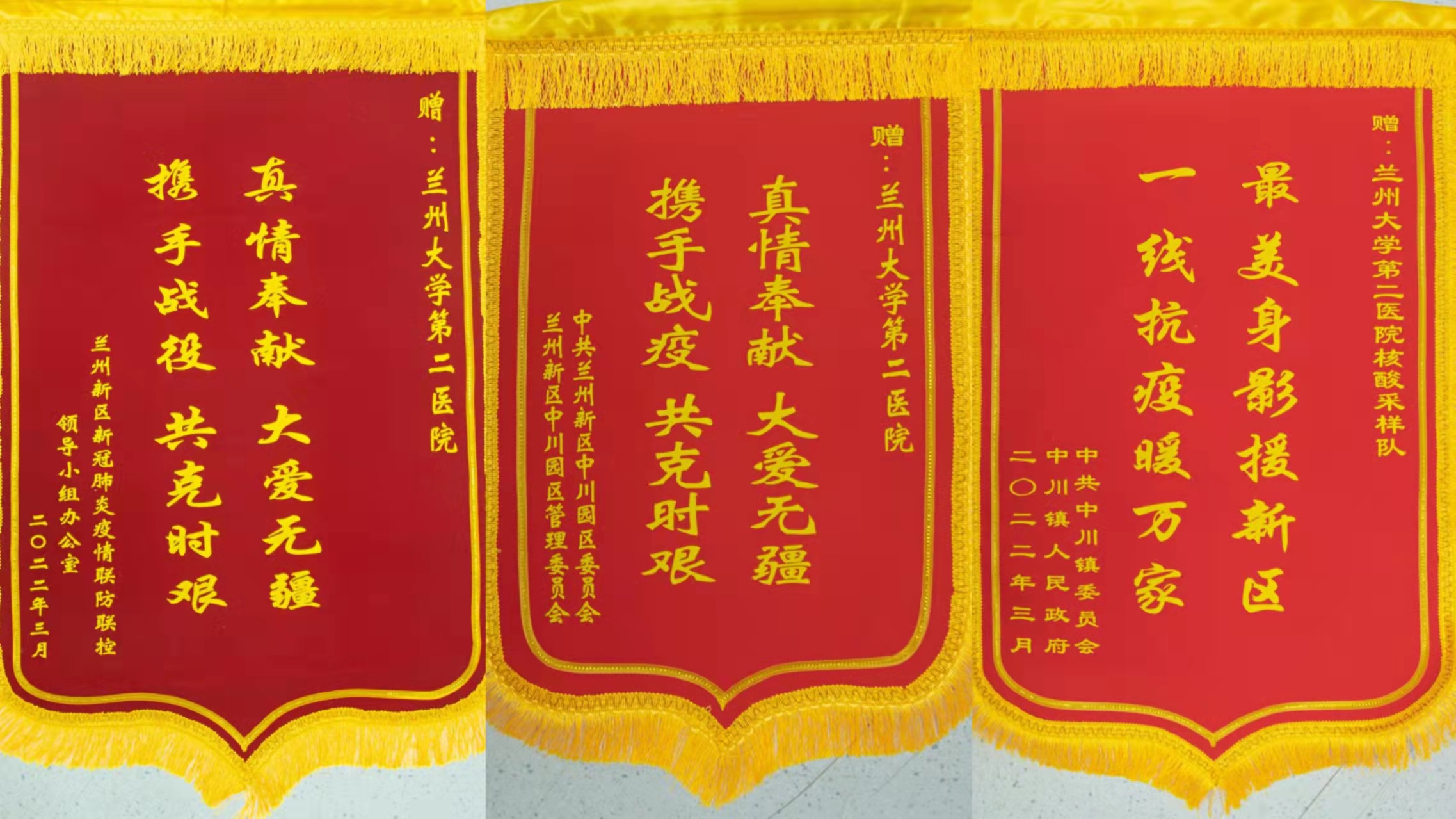 采样期间,队员们临危不惧、无私奉献,彰显了医务工作者敬佑生命、救死扶伤、甘于奉献、大爱无疆的崇高职业精神。队员们的优异表现也收到了来自兰州新区新冠肺炎疫情联防联控领导小组办公室,中共中川镇委员会、中川镇人民政府,中共兰州新区中川园区委员会、兰州新区中川园区管理委员会的锦旗。