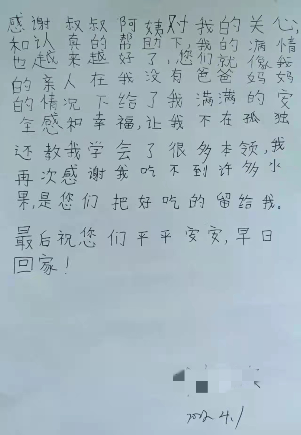 4月4日,小姑娘康复出院了。她在感谢信中这样写道:感谢叔叔阿姨对我的关心,在大家认真的帮助下,我的病情也越来越好了,您们就像我的亲人,在爸爸妈妈不在身边陪伴的情况下给了我满满地安全感和幸福,让我不再孤单,还教会我很多本领,把好吃的水果留给我,最后祝你们平平安安,早日回家!”稚嫩的语言,纯真的内心,凸现着纯洁的心声。