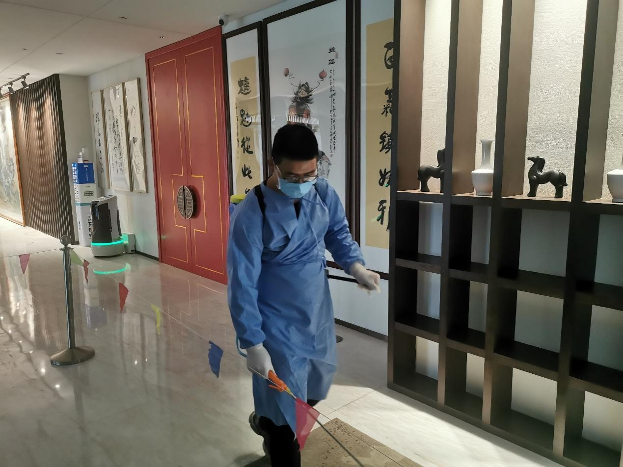 为做好医疗队闭环期间的后勤保障工作,酒店方与志愿者成立服务小队,每日与驻地管理小组对接,了解队员所需,及时补充、领取并配送生活、防疫物资。服务小队按需配送物品,满足每个队员的需求。服务小队送餐组负责每日三餐的配送,早班时间较早,在6点前必须要将早饭送到每个房间门口。消杀组负责酒店公共区域的消杀及垃圾清理工作,保证每天消杀3次并进行登记,每次背着40斤重的喷雾器走遍整个酒店。