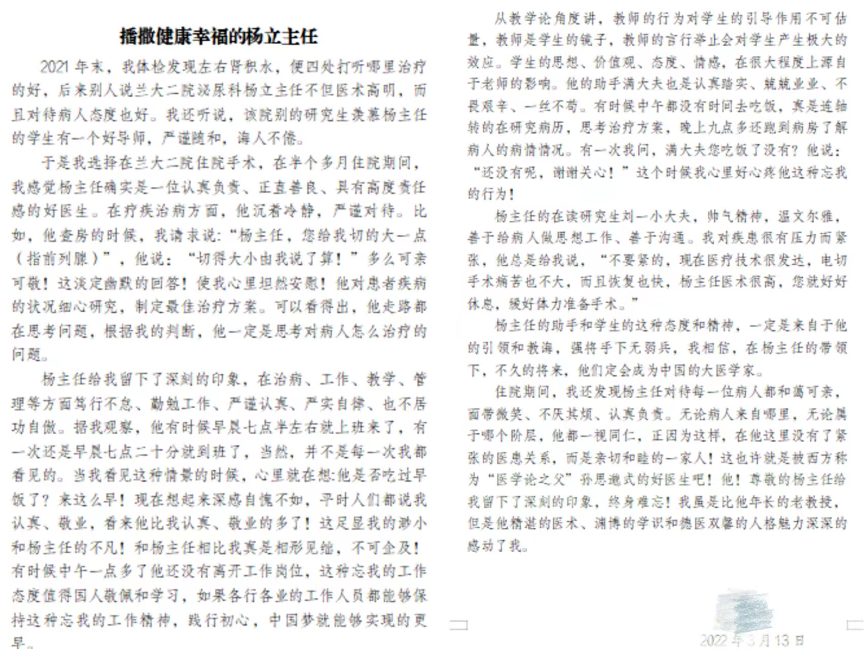纸短情长道感恩,句句感激暖人心。患者也在感谢信中分别这样写到:“杨主任给我留下了深刻的印象,在治病、工作、教学、管理等方面笃行不怠、勤勉工作、严谨认真、严实自律、也不居功自傲。”“住院期间,我还发现杨主任对待每一位病人都和蔼可亲,面带微笑、不厌其烦、认真负责,对于患者他都一视同仁,正因为这样,在他这里没有了紧张的医患关系,而是亲切和睦的一家人!”