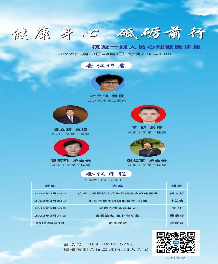 3月初,疫情发生后,广大医务人员及社区工作者夜以继日、持续奋战,为守护人民的健康安全和城市有序运行始终坚守在防疫一线。为缓解抗疫一线工作人员的心理压力,消除不良情绪,3月28日-4月1日每晚7点,兰大二院心理卫生科(甘肃省心理卫生中心)主办的“健康身心,砥砺前行”抗疫一线人员心理健康讲座在线上平台举行。全省各级抗疫一线200余人参加。