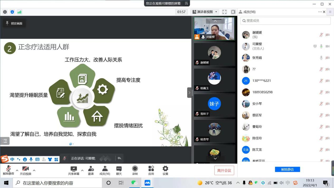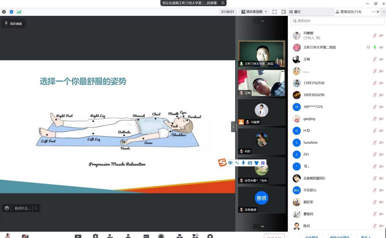 3月28日晚,兰大二院心理卫生科主任阎立新教授以“抗疫一线人员如何拥有良好睡眠”拉开了本次活动的序幕。他提出,睡眠对每个人都很重要,良好睡眠是打好这场“战疫”的基础,也是保持身心健康的重要前提,并提出了诸多科学建议与方法帮助大家高效提高睡眠质量。随后,兰大二院心理卫生科叶兰仙主任医师用通俗易懂的语言,针对如何识别生活中的“隐形杀手”——抑郁,深入浅出地分析了处在高压环境下容易产生的不良情绪及可能遇到的心理问题,指导大家学会缓解焦虑抑郁情绪,保持身心健康。王昕副主任医师对生活中常用的几种心理调适技术,如蝴蝶抱、松弛训练、腹式呼吸放松等,做了详细的讲解和演示,教会大家自己做自己的心理医生,及时调整,关爱自己。一病区护士长曹菊玲带领大家进行了团体心理减压技术——巴林特小组的实际操作。通过自我接纳,及时疏导,改变对事情的想法,学会求助和互助,增强应对压力的能力。二病区护士长张红丽为参会人员带来正念心理减压体验课,带领参会者用全新的方式体验“吃”这个人们最熟悉不过的生活片段。