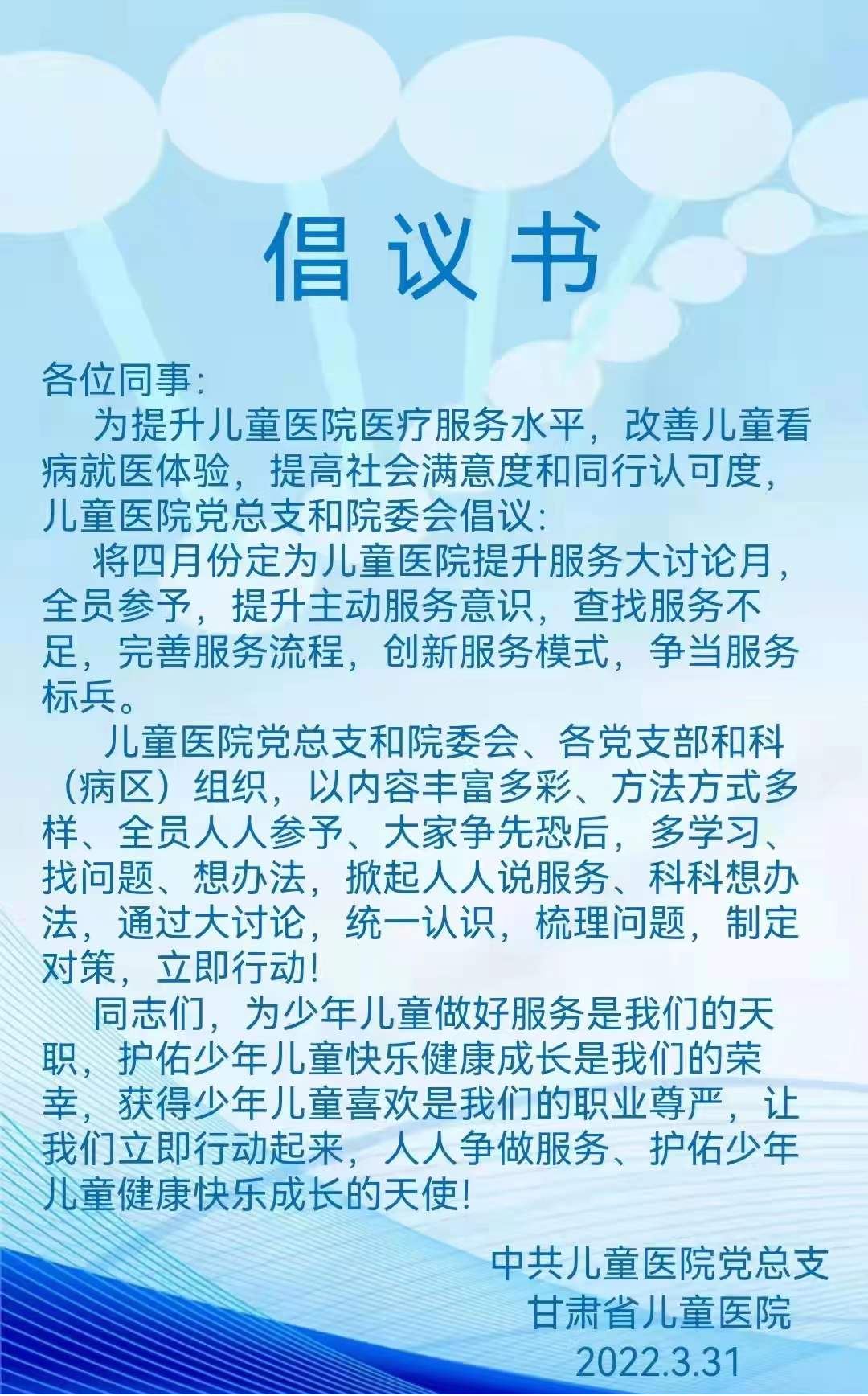为提升儿童医院医疗服务水平,改善儿童看病就医体验,提高社会满意度和同行认可度,儿童医院党总支及院委会在职工群内发起倡议书,将4月定为儿童医院提升服务大讨论月。以内容丰富多彩、方法方式多样、人人参予、大家争先恐后,掀起人人说服务、科科想办法,主动提升服务意识,查找服务不足,完善服务流程,创新服务模式。最后通过大讨论,统一认识,梳理问题,制定对策,立即行动,争当服务标兵。