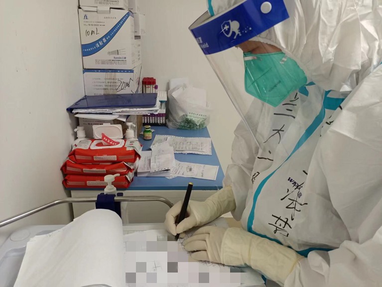 当推开门的那一瞬间,灯火通明的走廊映入眼帘。在护士长迅速、有序的分配下,我们有条不紊的开展工作,核对医嘱、巡视病房、核查治疗、消杀物品,时间总在忙碌中一点点的流逝,而防护服下的我们也被汗水浸湿,面屏下带着雾气却微笑的眼睛是我们互勉的动力,我们一组7人无一松懈、懒惰,因为我们使命在身。