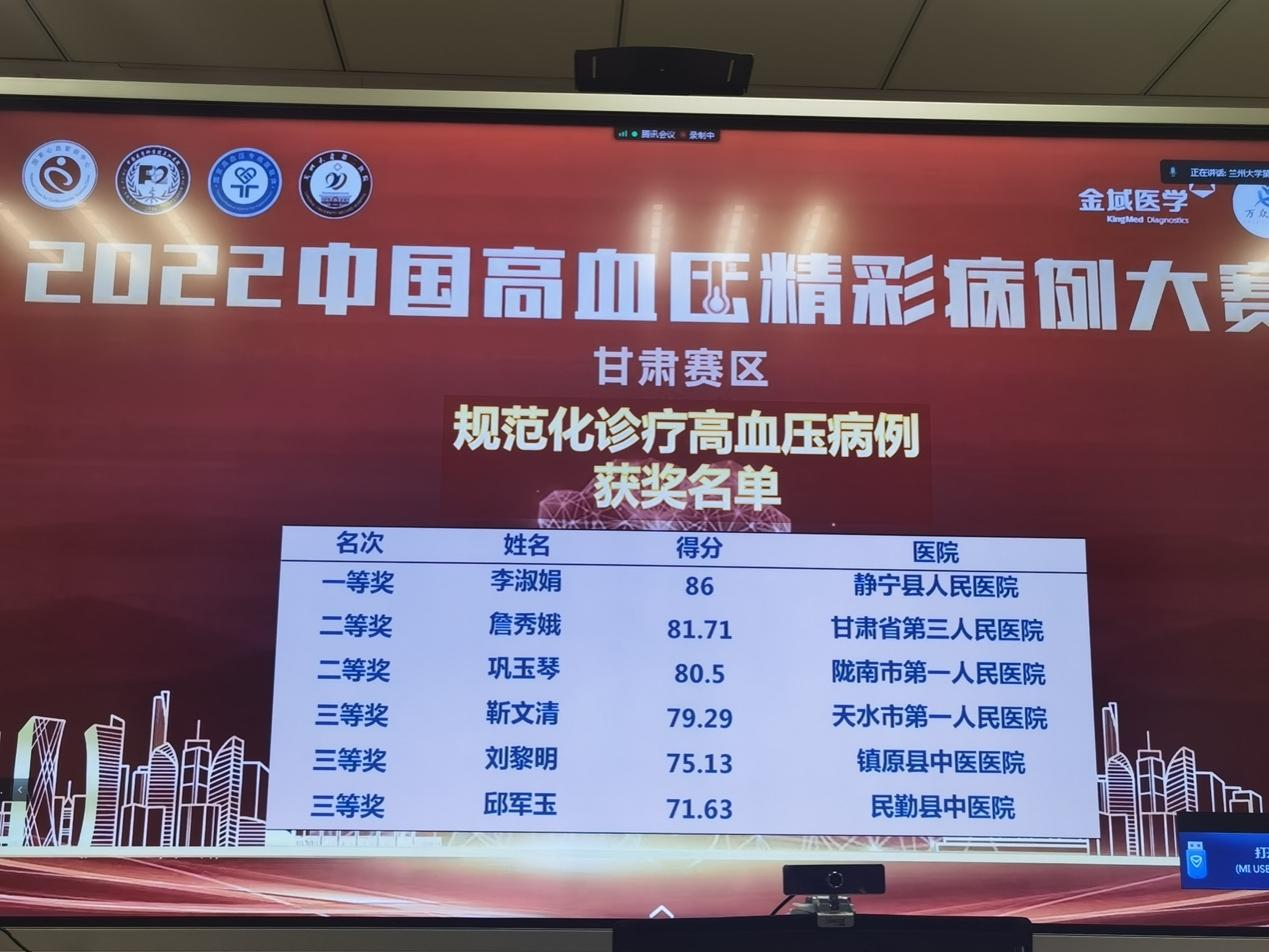 最终,经过一激烈的角逐,来自静宁县人民医院的李淑娟医师获得规范化诊疗高血压病例比赛的一等奖;兰大二院马瑞新医师获得疑难危重高血压病例比赛一等奖。
