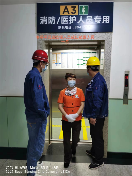 早上10点30分,演练正式开始。电力科电梯安全管理员接到电梯乘客报警称住院部①A3号电梯突然故障导致电梯卡在14层至15层之间,电梯门无法正常打开。接到报警电话后,电梯安全管理员立即通知电梯维保人员赶赴现场救援,并第一时间汇报了电力科负责人。随后,一名安全管理员继续在监控室严密监视电梯轿厢内被困乘客情况,另外两名管理员马上赶赴现场配合维保人员展开救援,10点35分,安全管理员与维保人员赶赴现场并确认故障情况,并立即制定救援方案:首先将电梯手动平层至安全位置后,然后由维保人员打开电梯门将被困乘客放出。10点45分,电梯轿厢内被困乘客安全救出,维保人员开始排查电梯故障原因,在解决了故障并试运行两次确认电梯正常后,将电梯交由物业公司重新运营。